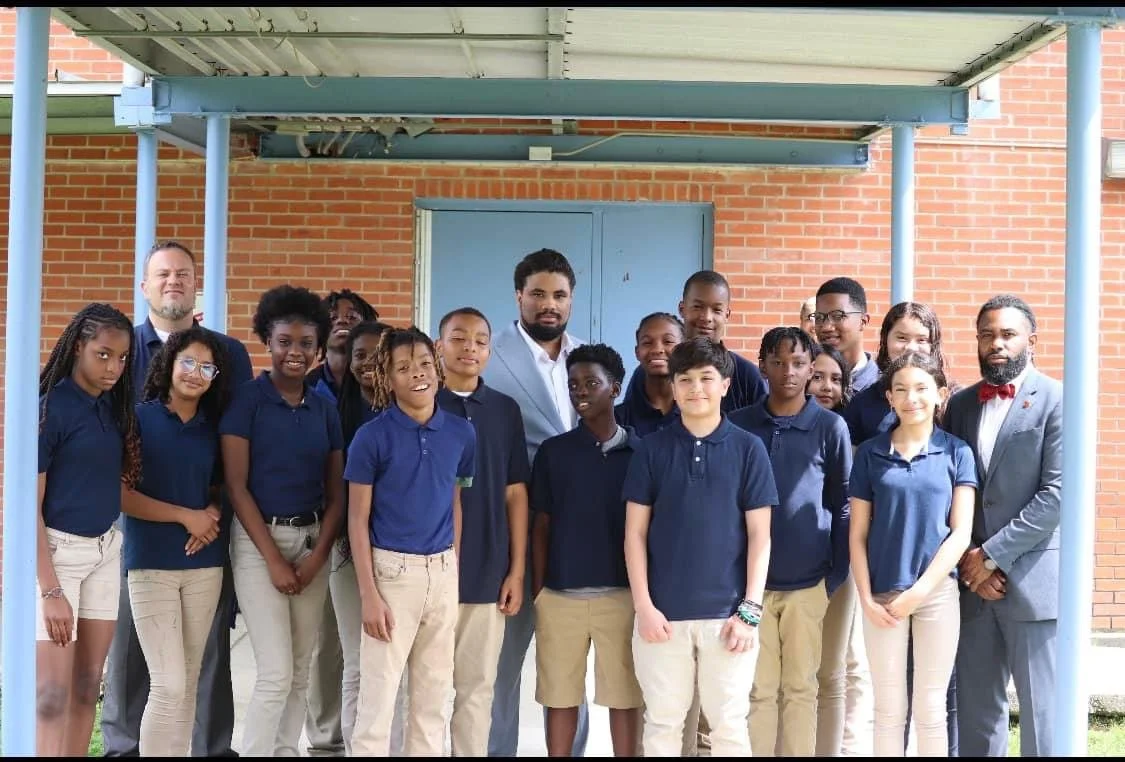WGI Founder Chance Wilson poses with students and staff at Westdale Middle School